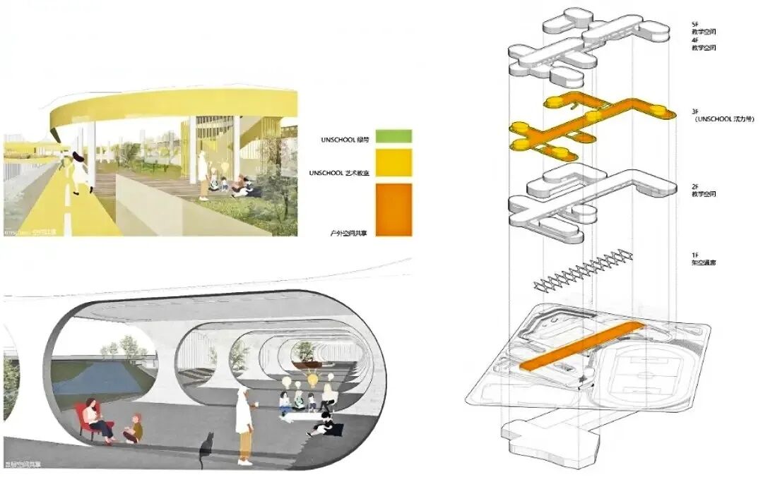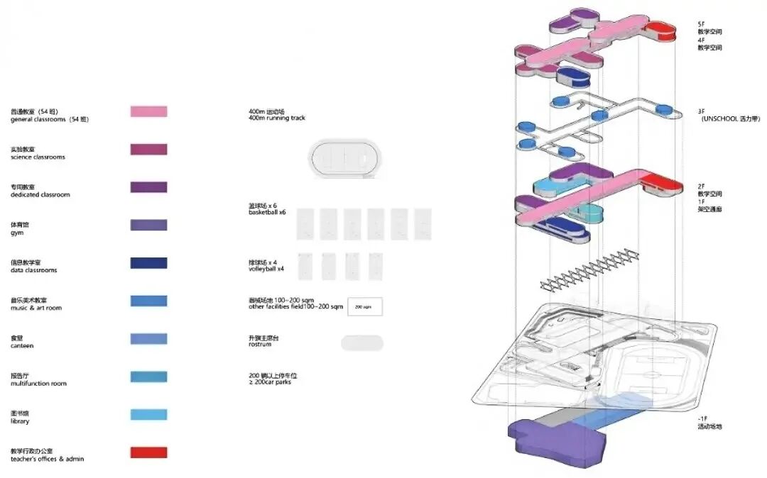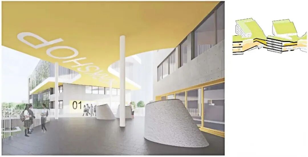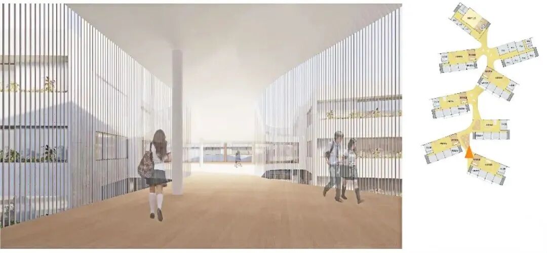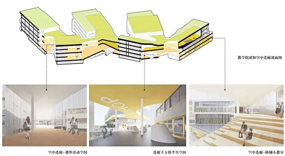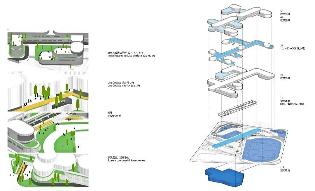 活力带将上下两层连接起来,在其中分布音乐美术等教室,满足高低楼层学生对于户外活动的需求,学生不必通过单一的路线往一个场地聚集。