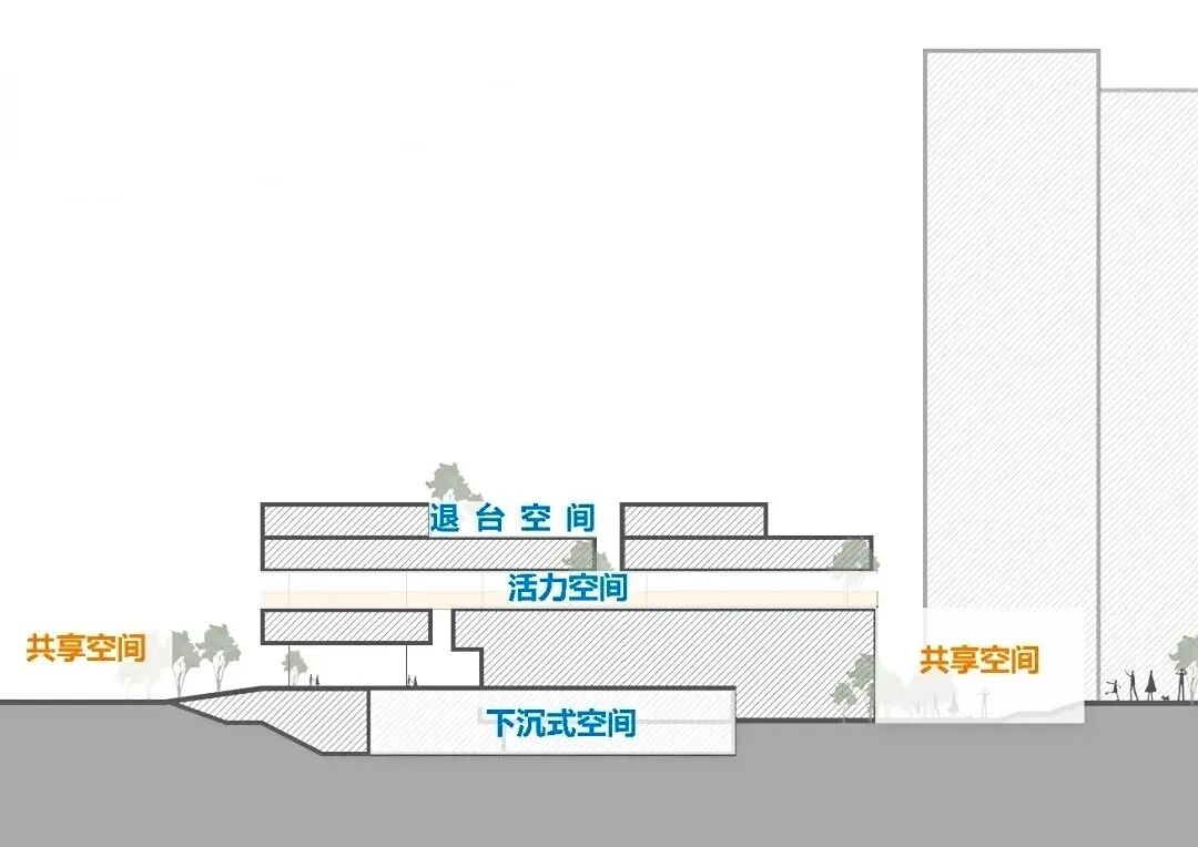 方案在校园内设置多处活力空间、下沉空间、退台空间等灵活空间,学生可以分散开展课余时间的活动。同时,这些空间也为楼层之间的人群流动提供了“可喘息”的缓冲空间,一旦遇到突发事件,学生可进入这些缓冲空间避险。