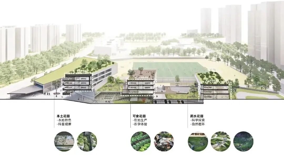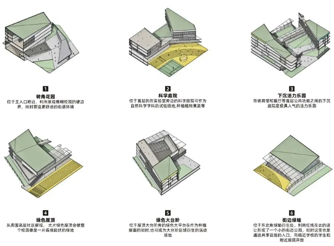 此外,各组团之间设置了转角花园、科学庭院、绿色大台阶等活动场所,学生们在课余时间可分散到花园、庭院、平台上玩耍,有效分散学生活动游线。