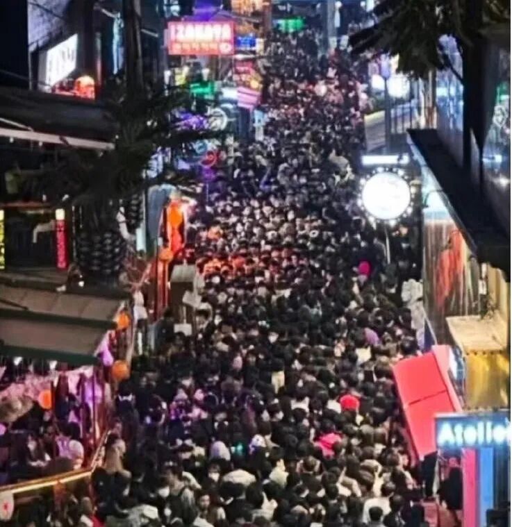 有报道说,此次首尔踩踏事件发生前至少10万人向一个点聚集,而在经过一个有坡度的狭窄巷道时人群堆积,前面有人摔倒,加之周边许多商铺没有及时打开大门,立马形成了多米诺骨牌效应。