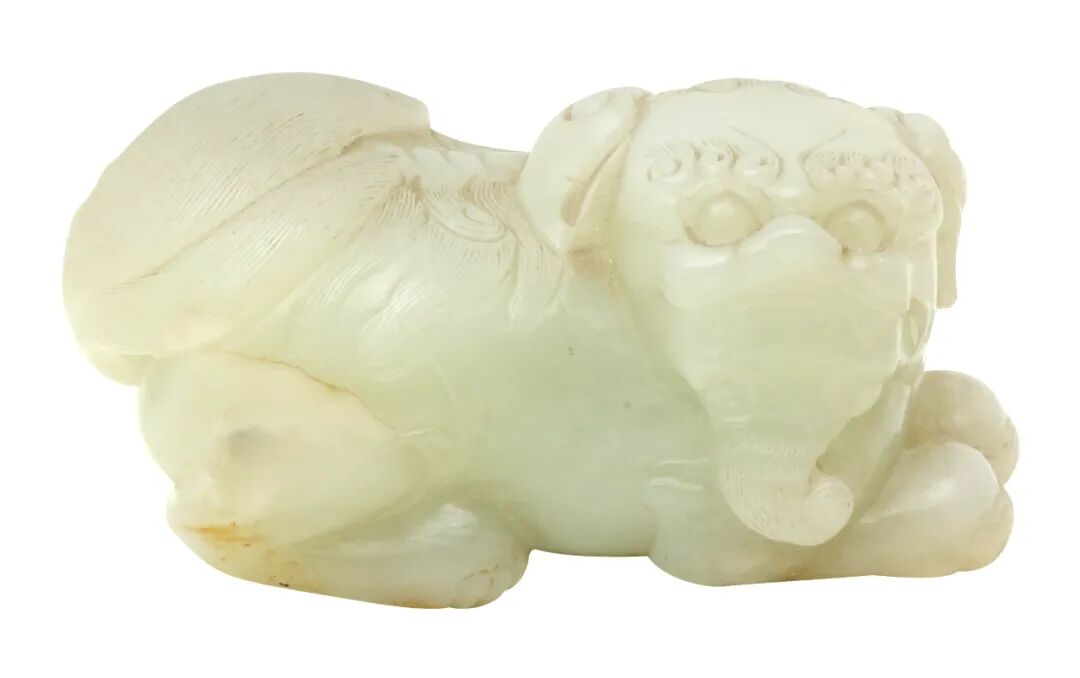 此卧佛狮以青白玉雕刻而成,玉质温润,细腻的工艺使其造型栩栩如生。佛狮的细节清晰可见,浓密的毛发根根分明,触其身犹如可感其肌理、骨骼。此小摆件源自1950年代组成的英国私人收藏,为齐仕阁今回秋拍上拍的玉雕之一。