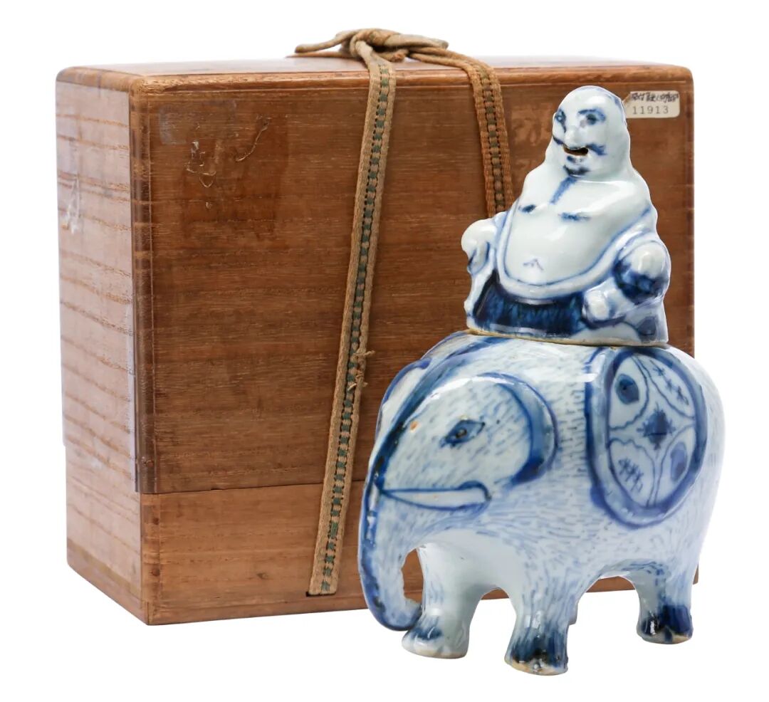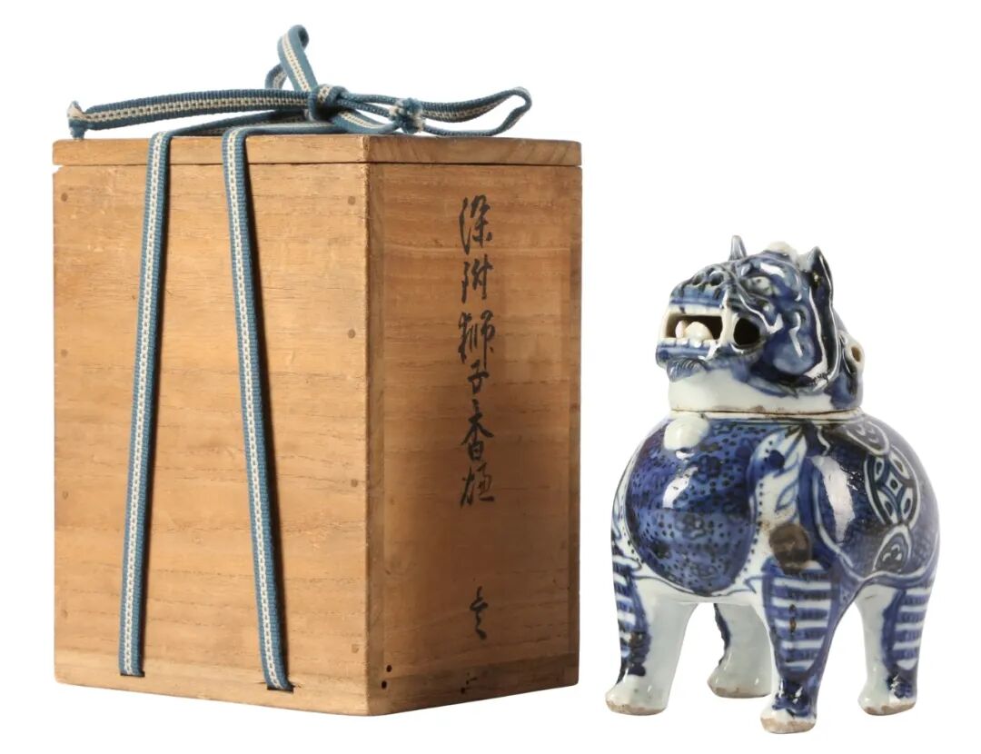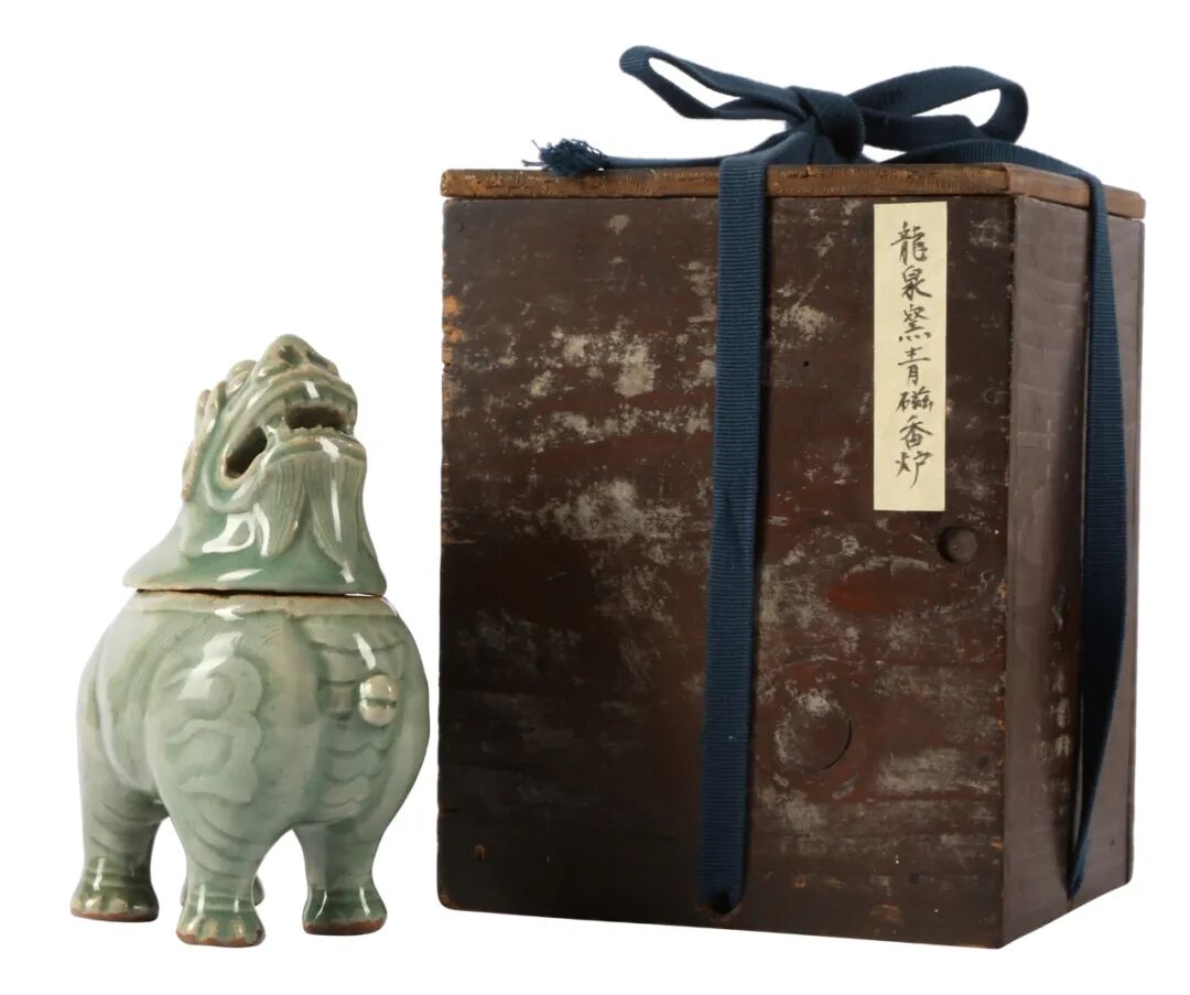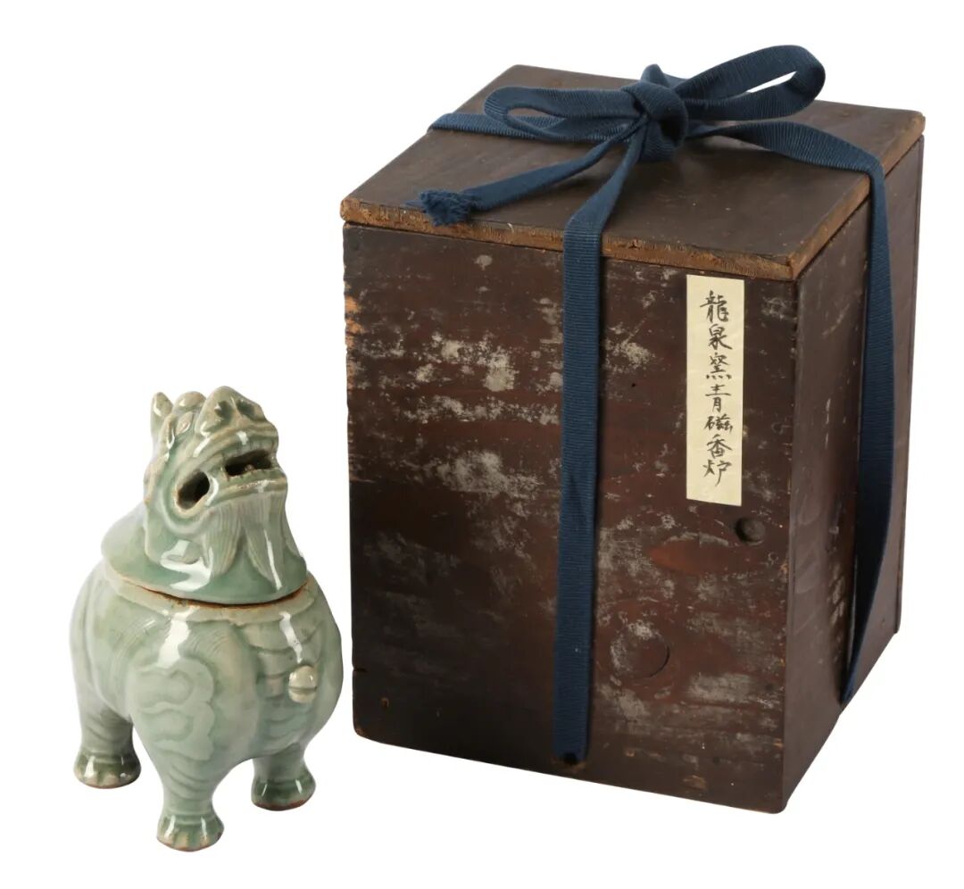 此晚明香盖炉以甪端为造型,为日本私人收藏。甪端张口露齿,体形丰满,并绘有铜钱及如意纹。甪端角为香炉盖,香气可从鼻、耳、口处散发。甪端独角,故常被误认为麒麟,以查明真相、掌握任何语言和快速穿越远距离而著称。此类香炉常见于青铜,瓷制实属少见。