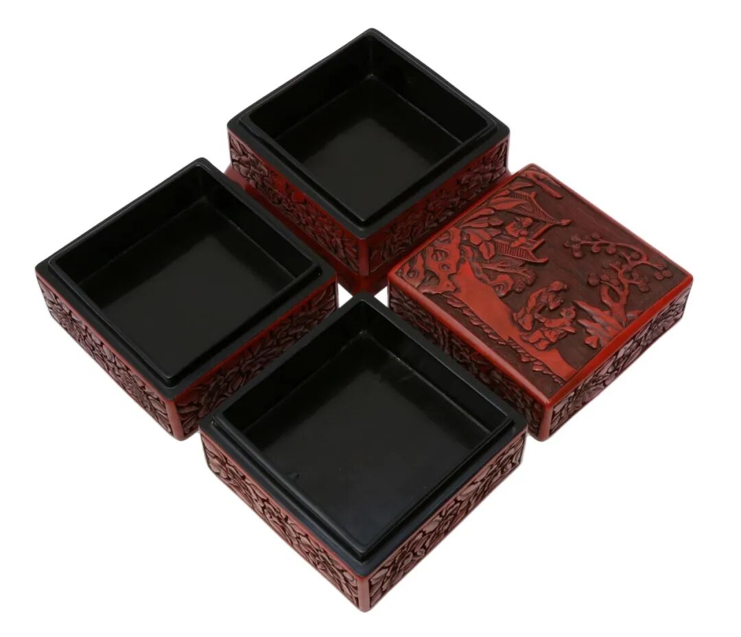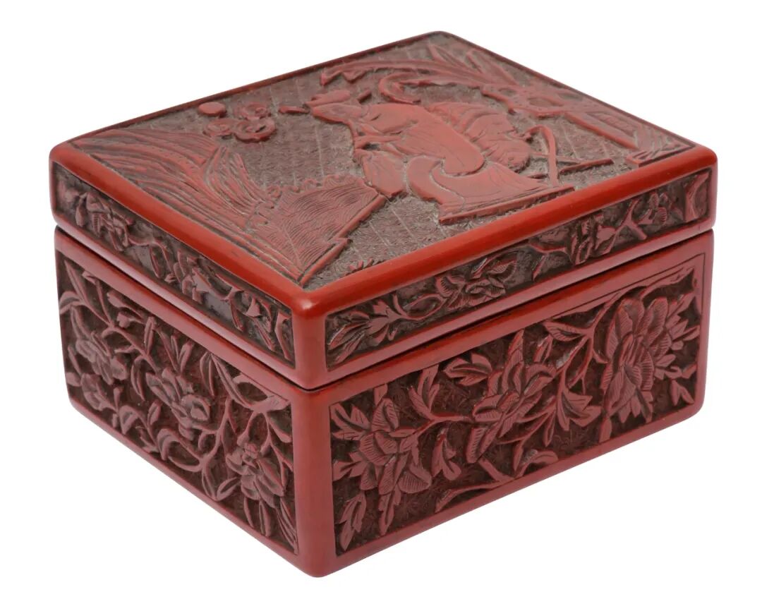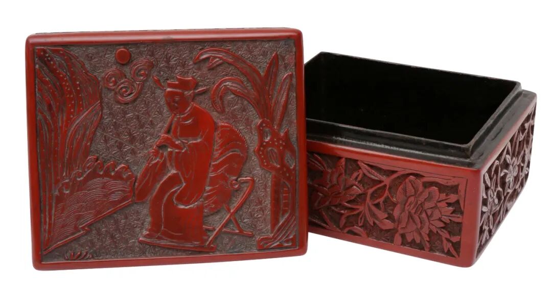 在明代剔红漆器中,「携琴访友」是常见的主题。此层盒的盖上刻有一位身穿长袍的士大夫走在林间小路,侍从紧随其后,腋下夹着的物品或是一把古琴。士大夫拜访隐士大概是仰慕其高尚的品德与才能,寻求隐士为求加深自己的学识。