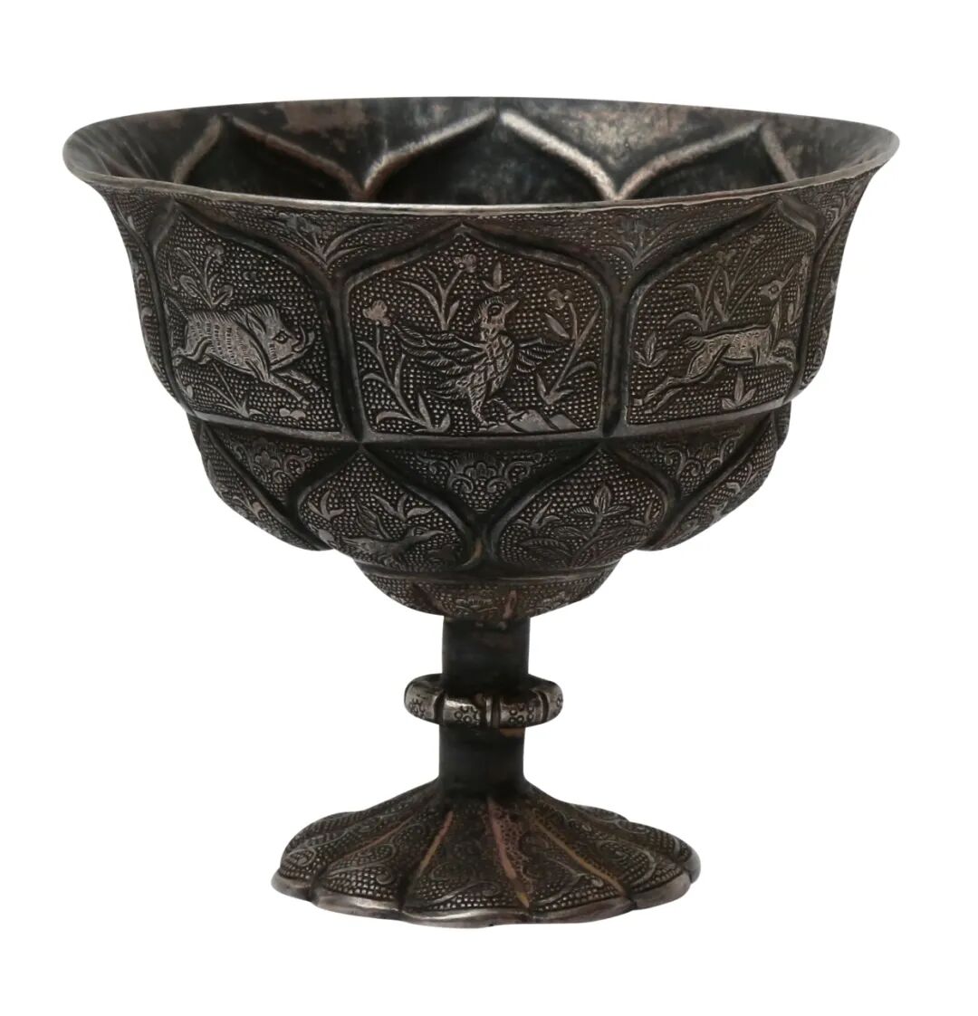 唐朝(618-907年)经济鼎盛,日益稳定的经济环境,促进了长途贸易的发展,而丝绸之路则为原材料、新技术和工艺制造的传入发挥了关键作用。在此期间,陶器、青铜器和铁器被普通民众广泛使用,而金银器则成为精英身份地位的象征。唐代金银器工艺技术水平与创新与日俱增,可谓达到了顶峰,造就了如像此高脚杯的银器。
