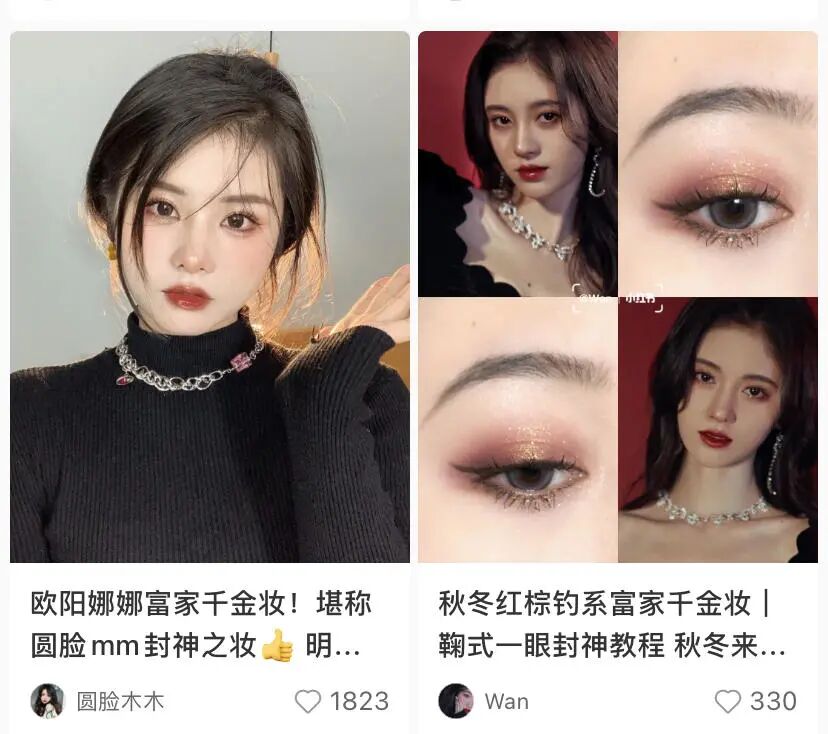 易梦玲还在小红书上手把手教学“茶艺妆”,要点就是眼周和眼下的大面积腮红,以及迷离、无辜的幼齿眼神。