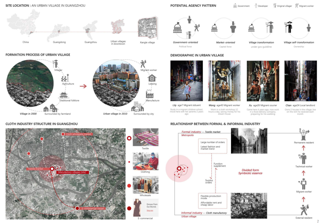 基于广州市中心城区独特的非正式城镇化珠江三角洲,本项目选取了几个嵌入广州市中心城区的城中村,分析了其中涉及的多重利益和冲突。自从人们开始认识到这些空间的非正式性价值以来,关于空间正义、社会阶层、社会博弈理论、移民流动等方面的研究就大量涌现。我的重点是它的非正规性给城市复原系统带来的各种可能性,在保护其低租金住房市场的前提下,试图增加其经济多样性,召唤集体记忆,回应自然环境,并确保每个群体都有机会参与这一进程,从而提高城市的综合复原力。