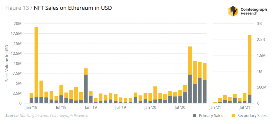 销售额方面,2021年,Ethereum(以太网)的NFT销售额已超过90亿美元,相较于2020年增长了2500%,很难不说一句:NFT牛的。