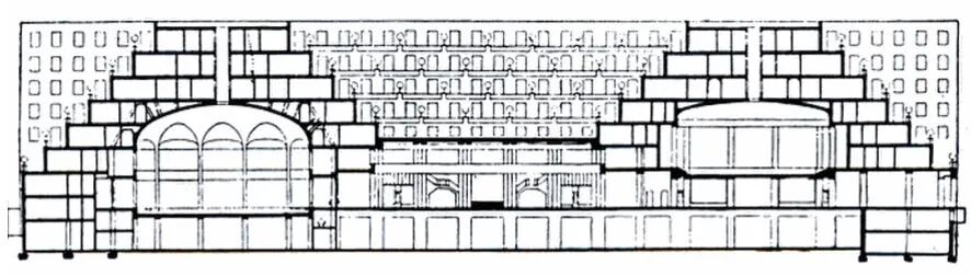 两个对称的金字形神塔立在一个巨大的底座上,每个都围出一个中央拱形空间,容纳大宴会厅和一个溜冰场,通过屋顶进行采光。