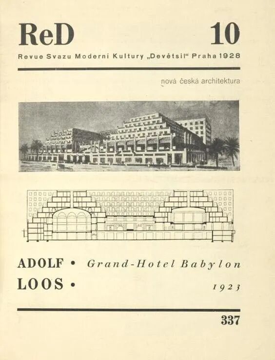 卢斯是19世纪末和20世纪初最具影响力的欧洲建筑师之一,以注重功能性和反对装饰而闻名。早在1913年,卢斯宣称“对美国的学习之旅留下深刻印象,美国酒店大堂最大的特点是公共街道的延伸”。在卢斯对酒店感兴趣的背景下,20年代和30年代捷克先锋派的领军人物卡雷尔·泰格(Karel Teige,1900-1951年),暗示“卢斯构思了尼斯一家大型露台酒店的设计”,他以贝内特的书命名,颠倒了小说的词序,将其称为“大酒店巴比伦”(Grand Hotel Babylon)。