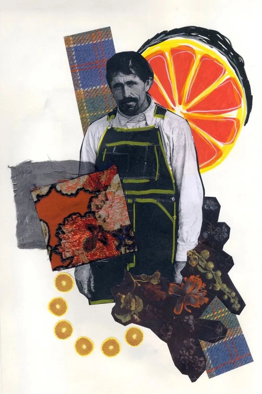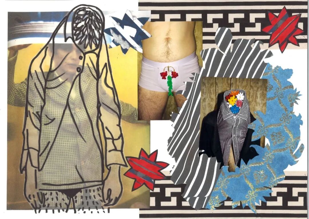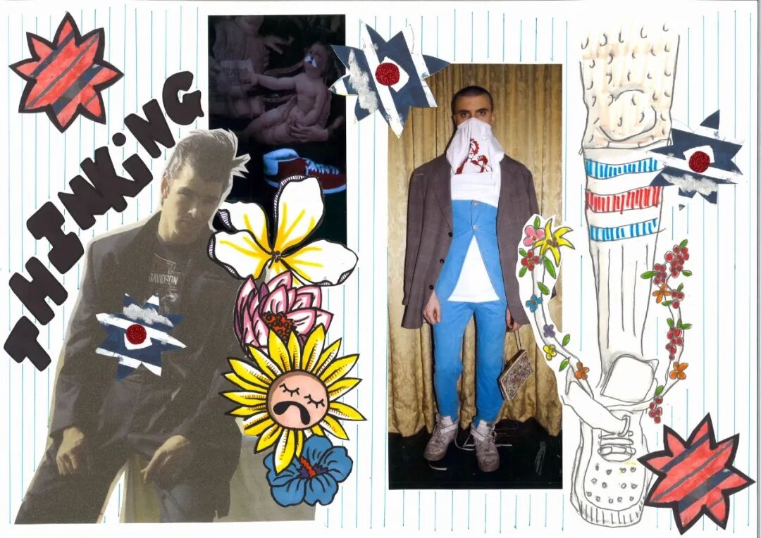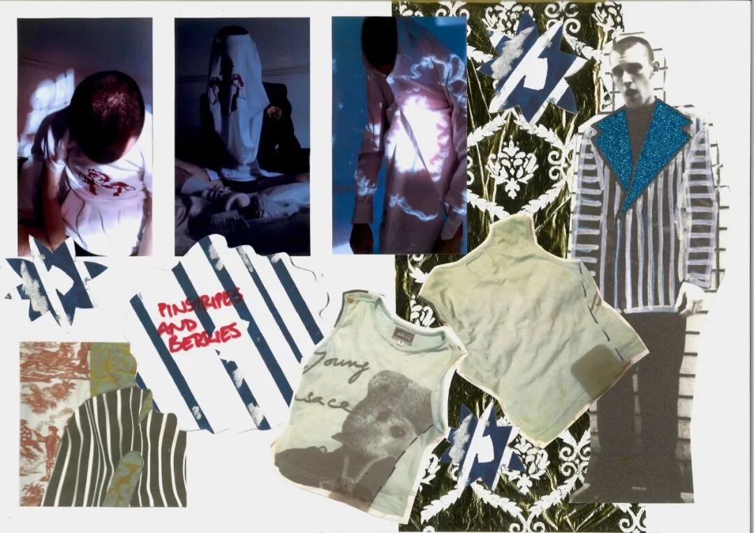 Nathan Korn设计的过程大多是用拼贴的形式呈现出来,他通过PS软件将需要的图形扫描出来,再通过拼贴的形式,拼合成想要的图片,最后印刷到服装上。