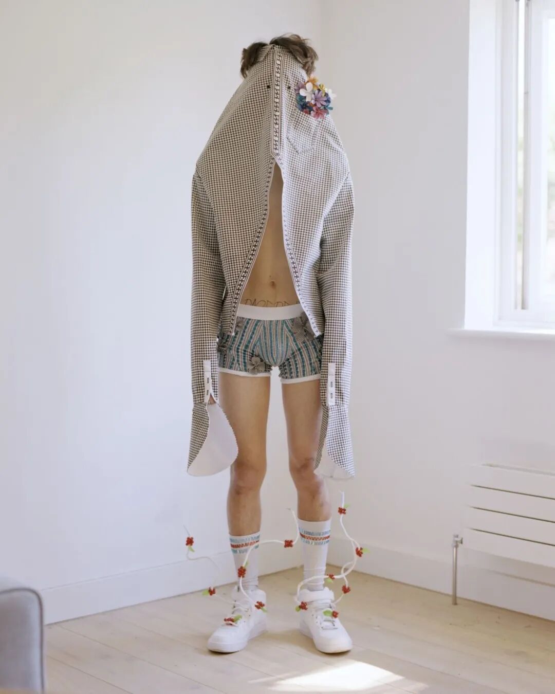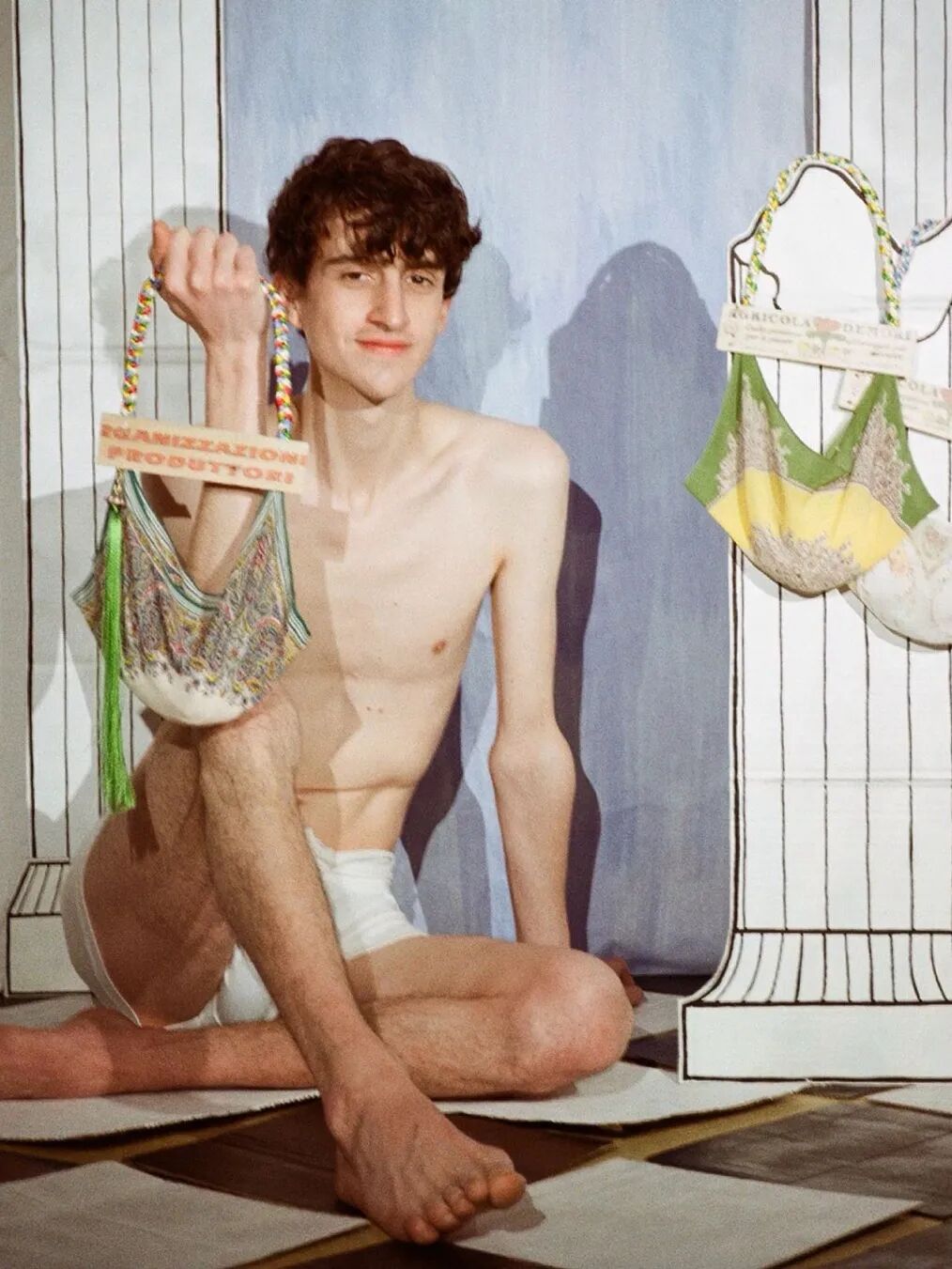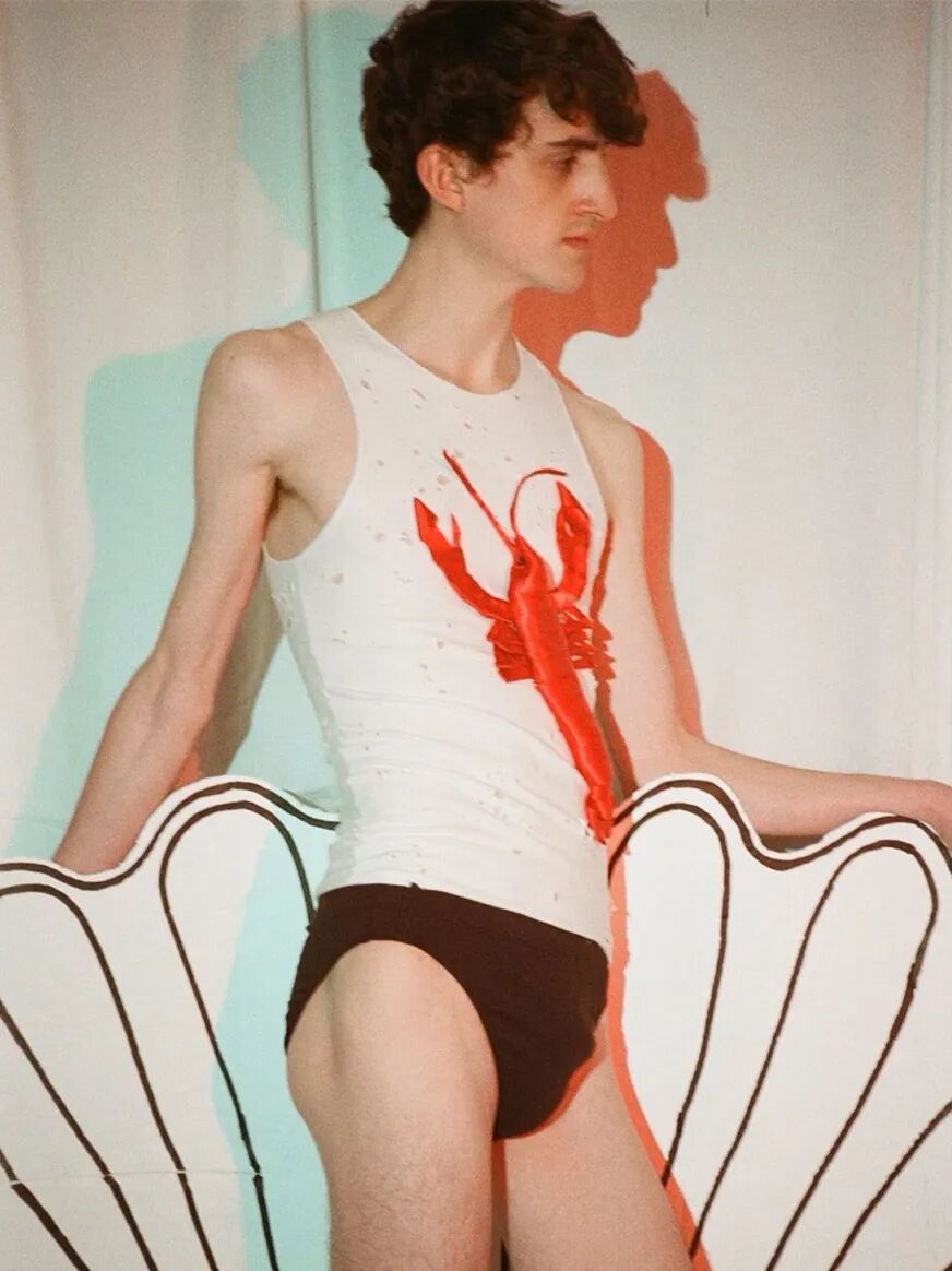 Nathan Korn的设计很大程度上受到其少年时期被绿色环绕的自由氛围的启发,他曾说:“这些别具一格的服饰是为了那些性感的男孩儿而设计的。”因此,Korn将许多,例如小雏菊、丝带、贝壳等充满少女气息的元素运用在他的男士内裤设计中,打破人们对性别分类固有的认知,来塑造勇敢做自己的且富有浪漫色彩的男孩儿角色。