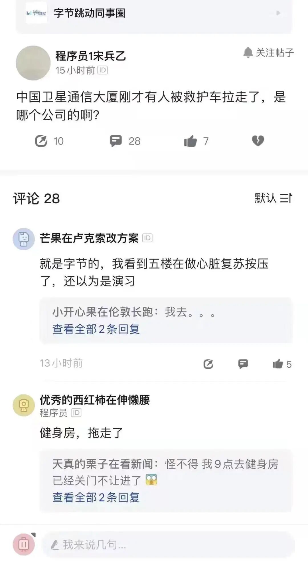 字节跳动同事圈爆料,有人被救护车拉走了。