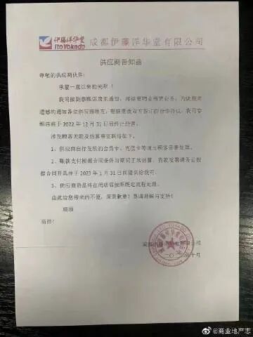 10月28日,一份印有「成都伊藤洋华堂有限公司」公章的《供应商告知函》显示,成都伊藤洋华堂春熙店将于今年12月31日后终止经营,系租约到期。