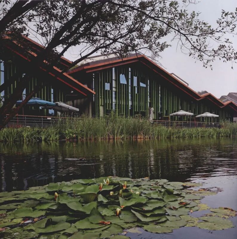 建筑所在的江洋畔生态公园,原为西湖疏浚淤泥库区,经过将近十年的表层自然干化,已形成与周围山林不同的,以垂柳和湿生植物为主的次生湿地。