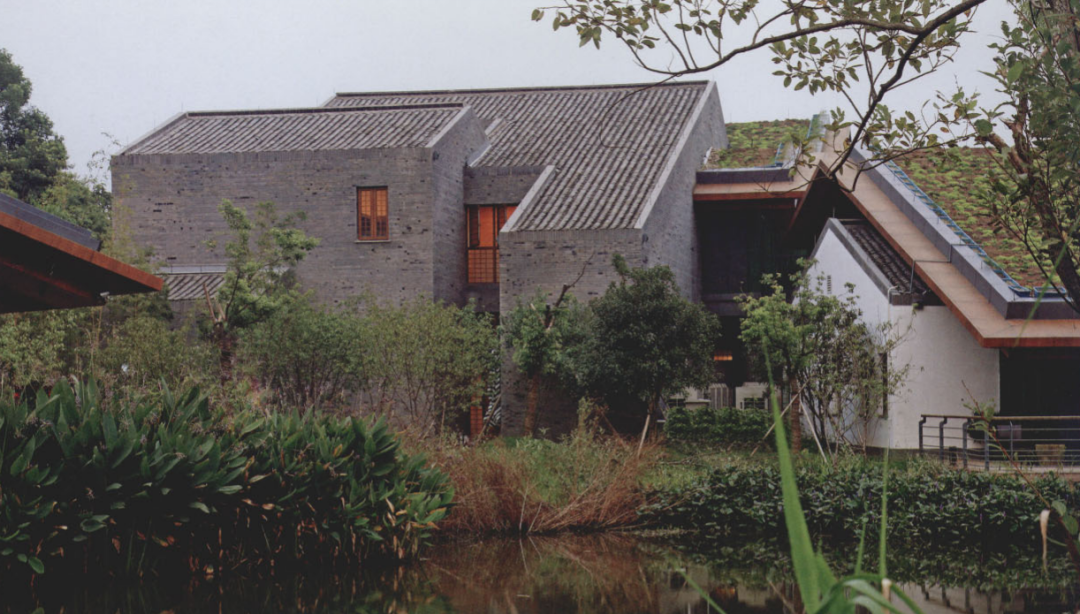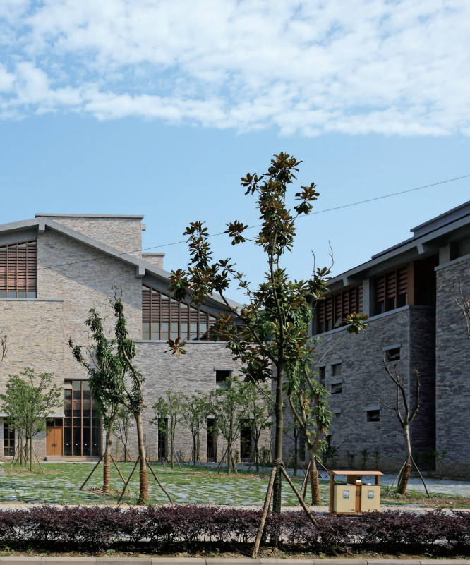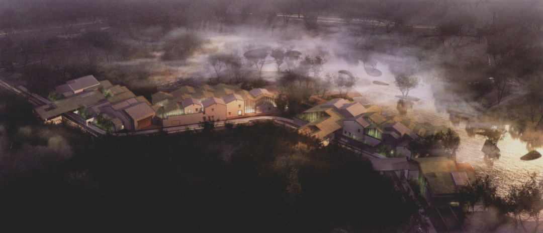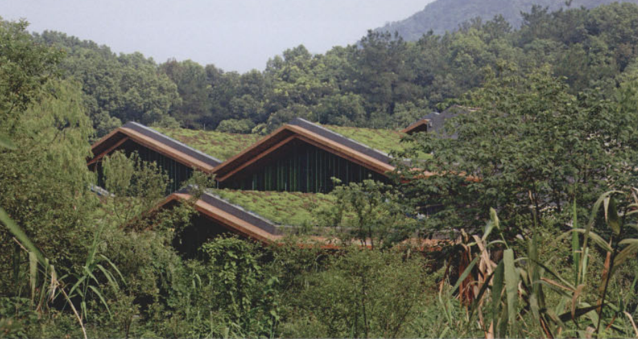 建筑体量的拆分,削弱对公园的压迫感,也保留了公园与钱王山庄之间的视觉通廊。连续折面坡屋顶的形式,进一步减小了建筑的尺度,形成统一而又富有韵味的形体和空间变化,并与自然山体轮廓相呼应,绿色植草屋顶也使建筑真正地融入环境之中。
