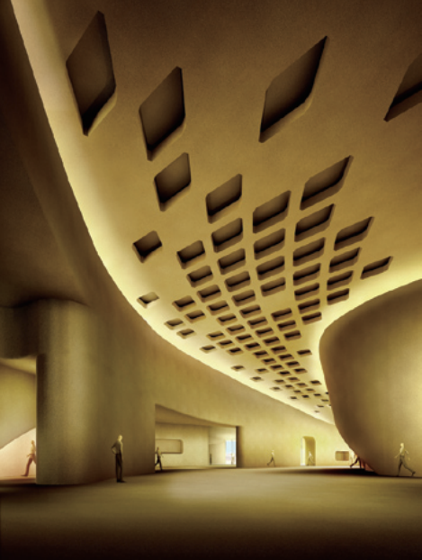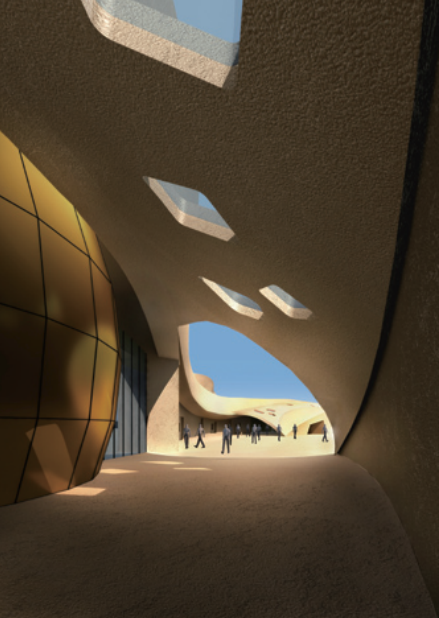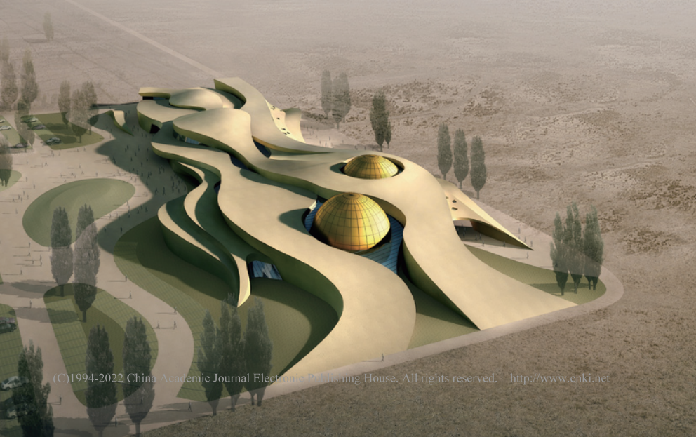 “设计伊始,我们最初的感动来自对大自然的敬畏和对古代工匠精美艺术的敬佩。这座建筑,应该是大漠戈壁中的一座小沙丘,造型既如同流沙,如同雅丹地貌中巨舰般的岩体,又类似矗立在沙漠中的汉长城,莫高窟壁画中飞天飘逸的彩带,充满着强烈的流动感。若干条自由曲面的形体相互交错,蜿蜒起伏,巨大的尺度和体量将沙漠地景建筑的特征表达得淋漓尽致。”
