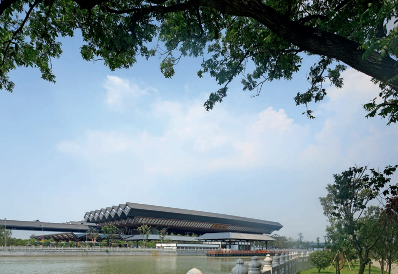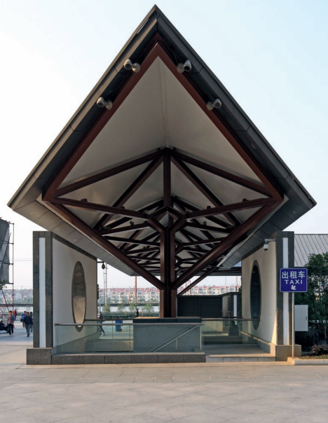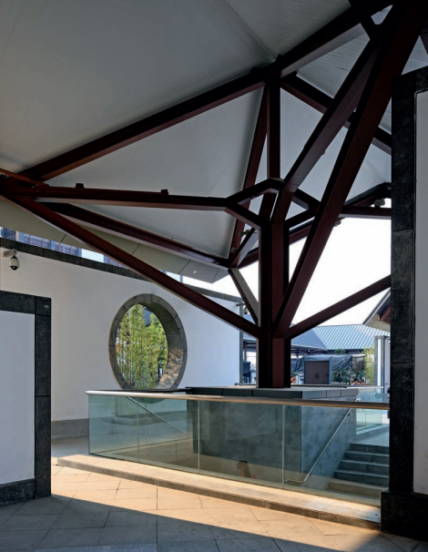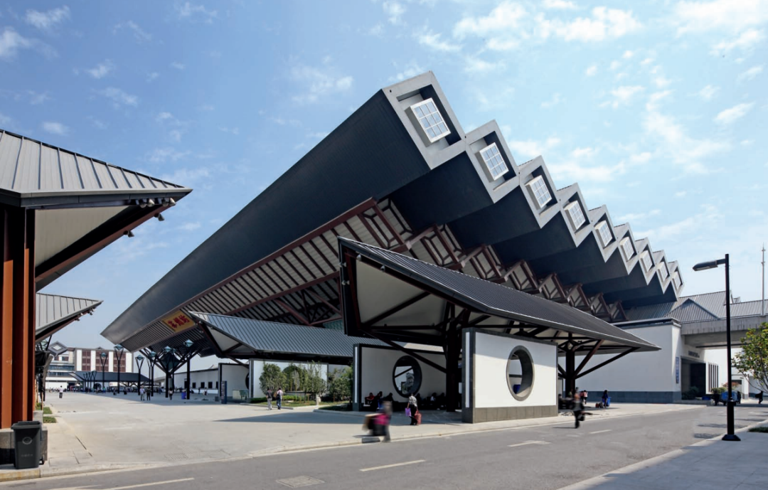 站房入口深远的出檐,外墙的金属格栅,两组承载屋架的大型菱形灯笼柱,加之灰、白、栗三色搭配的苏式淡彩,以及功能用房围合的大大小小的庭院,半室外的下沉广场,环绕的候车敞廊,都使这个庞大的现代化车站能够与古城对话,成为城市的有机组成部分。