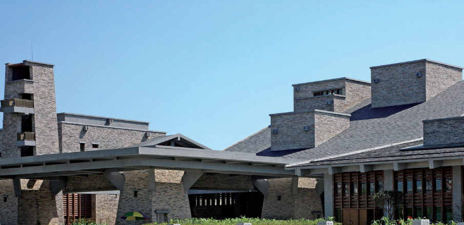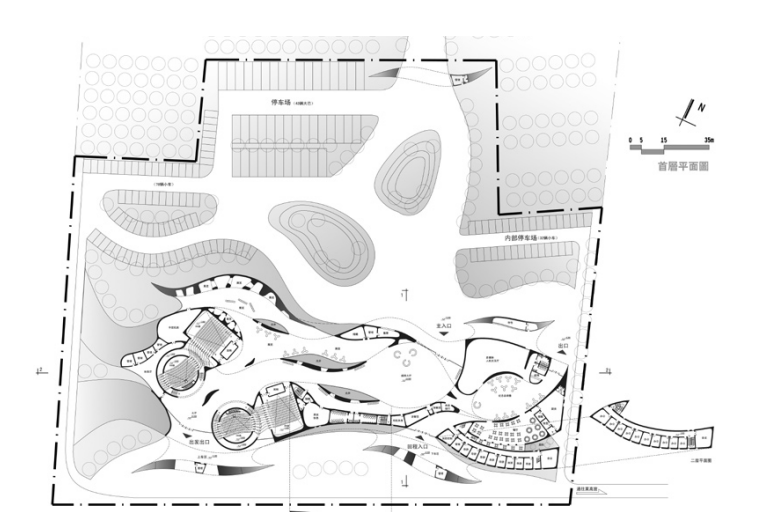 为了削弱建筑对生态公园的压迫感,建筑体型随山势和地形蜿蜒转折,自然断开,划分成贵宾楼、餐饮区、博物馆经营区和固定展区四个功能组团。