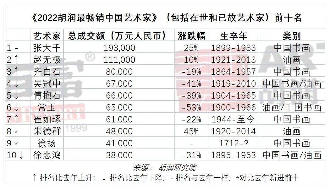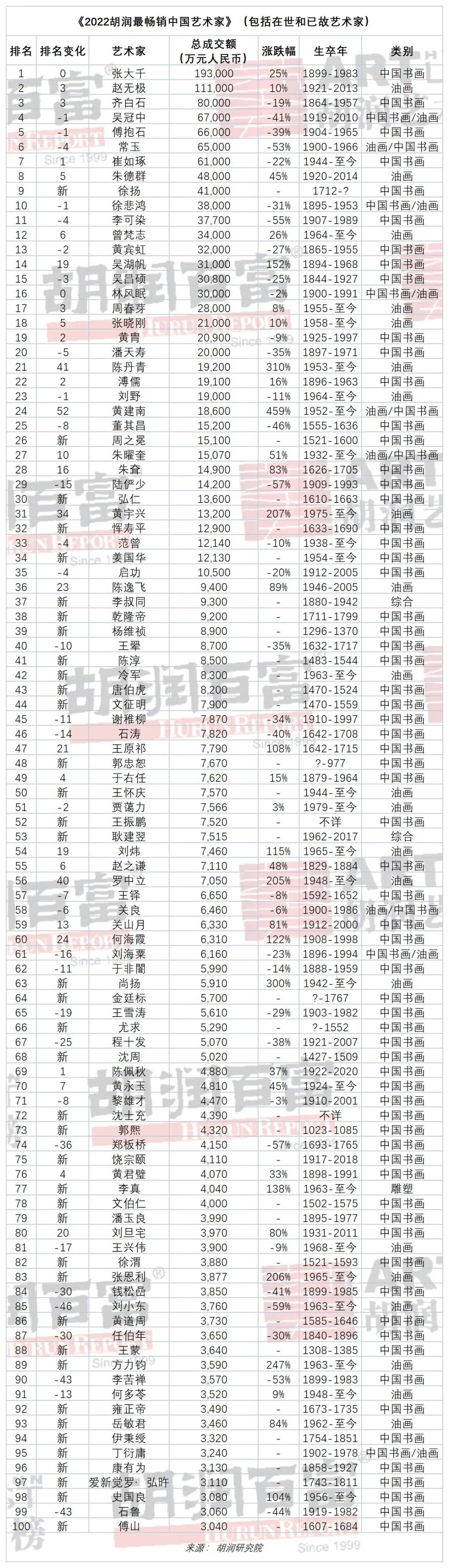 《2022胡润最畅销中国艺术家》(前100名中国在世和已故国宝艺术家)中,国画大师张大千成交比上一年增长25%,以19.3亿元第八次位列榜首。