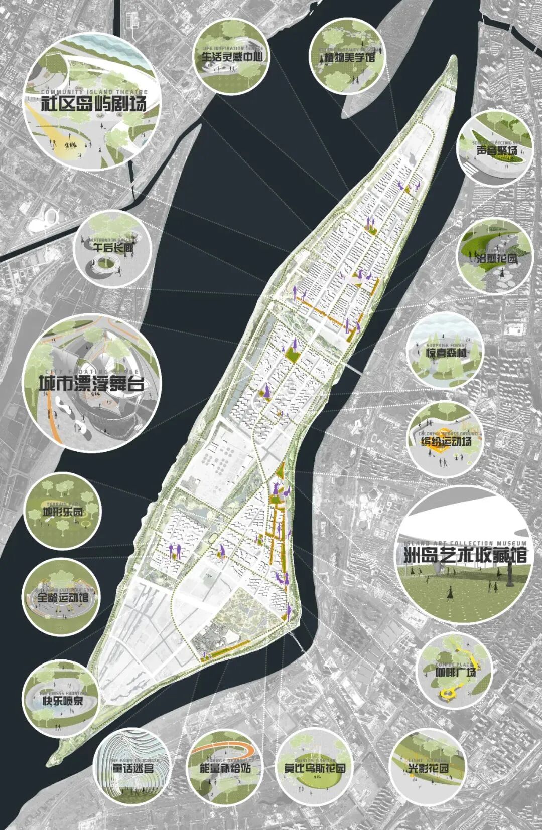 在中新南京生态科技岛,安道正在借由实施口袋公园计划,将我们的这一理念付诸于现实。我们在“1分钟城市理念”的指引下,将业已逐步弱化的城市公共空间进行了优化与整合,并植入了剧场演艺、户外健身、游戏互动、社交休憩、教育与生产等不同的城市功能,让原本散落在社区和商圈之间的口袋公园、邻里公园和小型广场发挥出了更大的价值,通过这些公共空间的整合与优化,真正构建起一个1分钟的低碳生活图谱。
