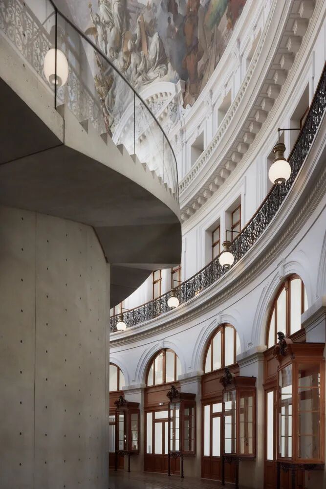 站在筒内空间中央,一些现代经典艺术品展览其中,同时纯净的混凝土壁将人们的视线引导向顶部的巴洛克壁画。站在筒壁顶部,人们有机会近距离观看屋顶精美的壁画,敛目俯瞰,又能看到现代艺术品琳琅陈列。