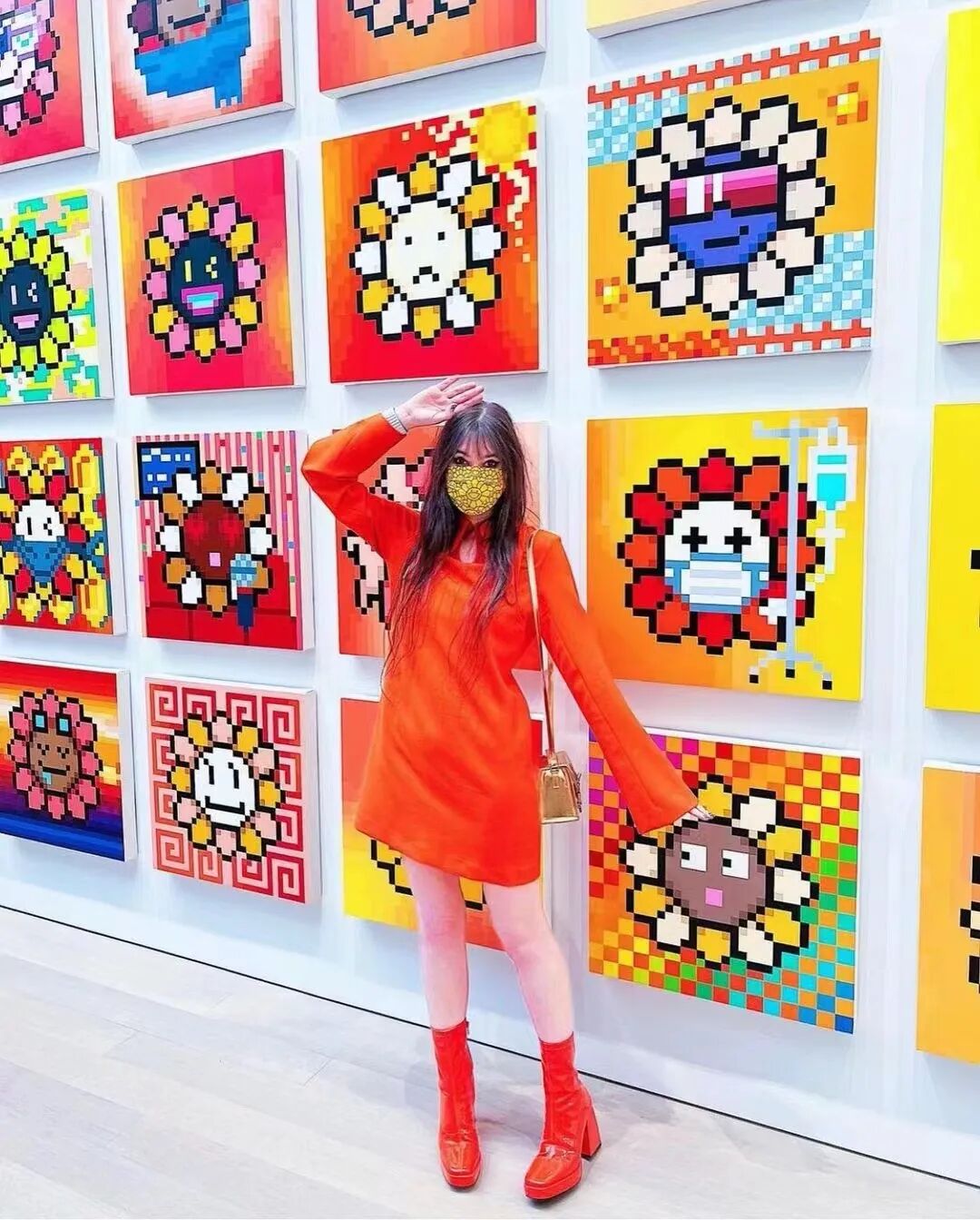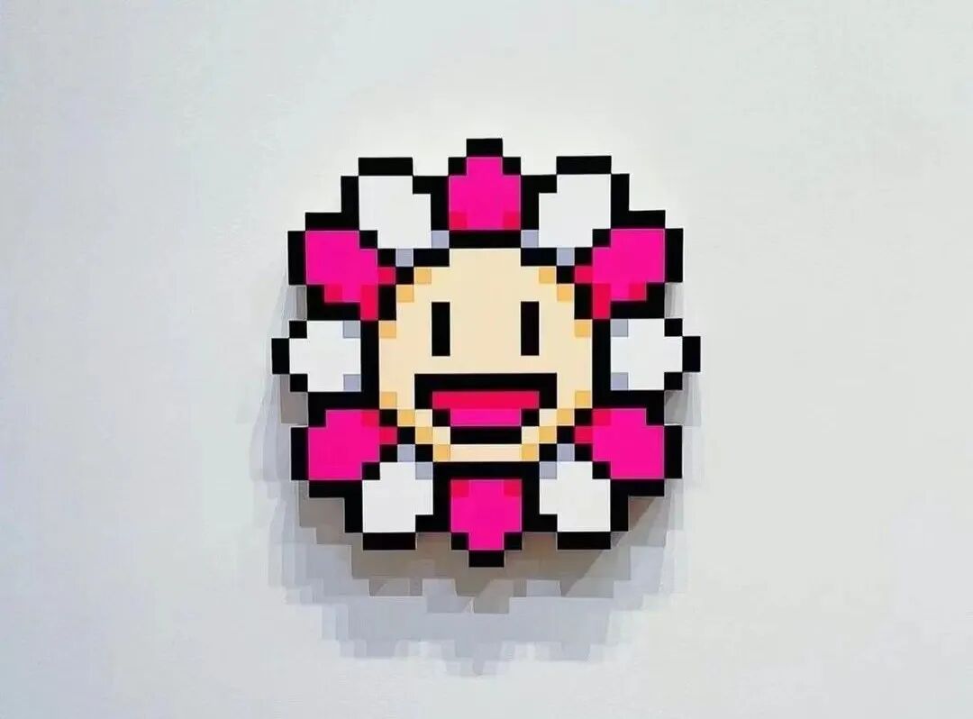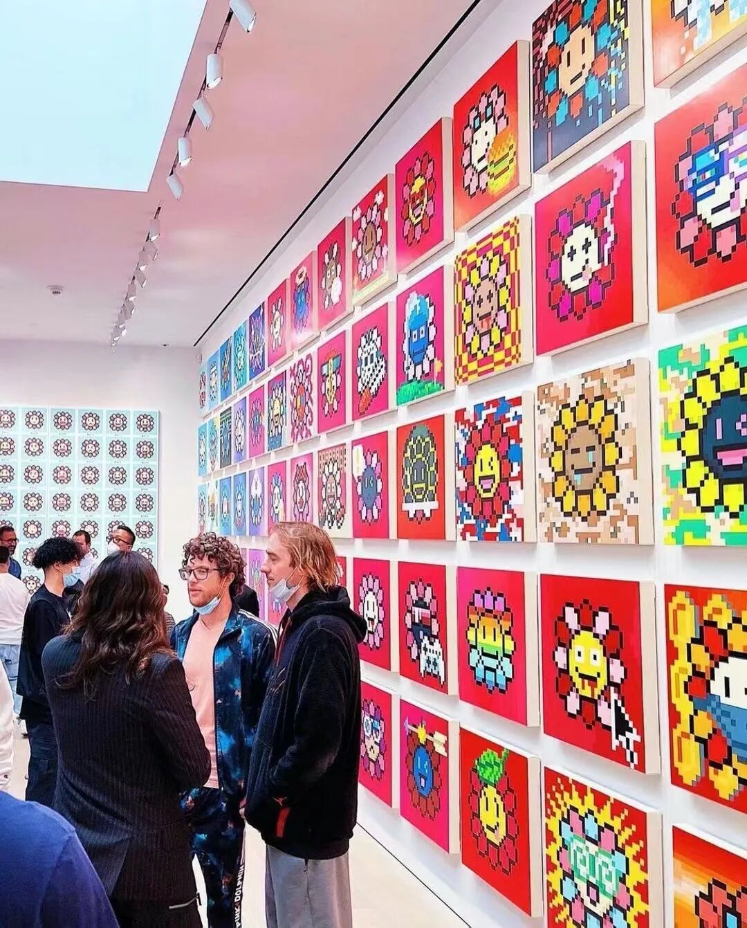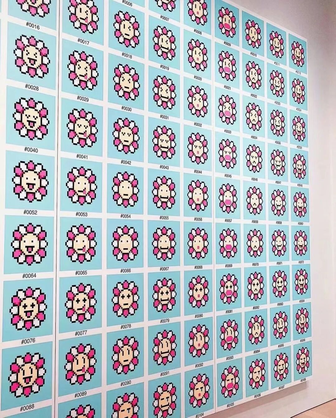 象素化的NFT头像,一下子把人们带入到80年任天堂红白机(Nintendo Famicon)时代。恰好契合了村上隆超扁平美学风格。现场展出108朵花的排列组合。