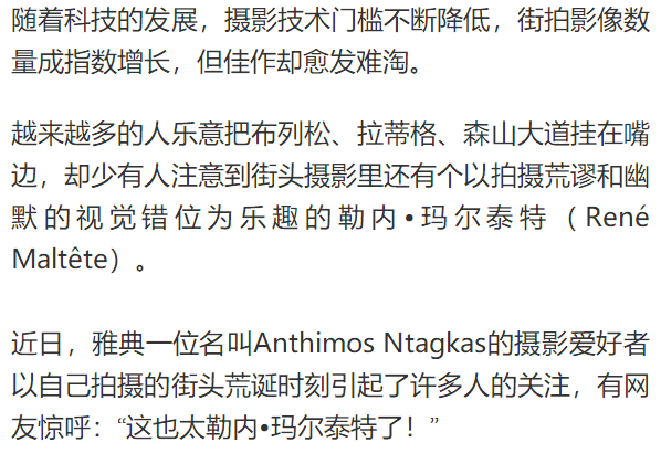 老柒有话说:街拍成为越来越多摄影师长期专注的类别,之前我们曾经说过拍摄这个城市,拍摄自己对城市的理解和城市和人的关系。今天我们要介绍的希腊街头摄影师勒内.马尔泰特的作品,他专注和地实践错位摄影,他在荒诞视觉错位里找寻真实。任何人都能街拍,当时如何形成自己独特的风格值得我们深思......