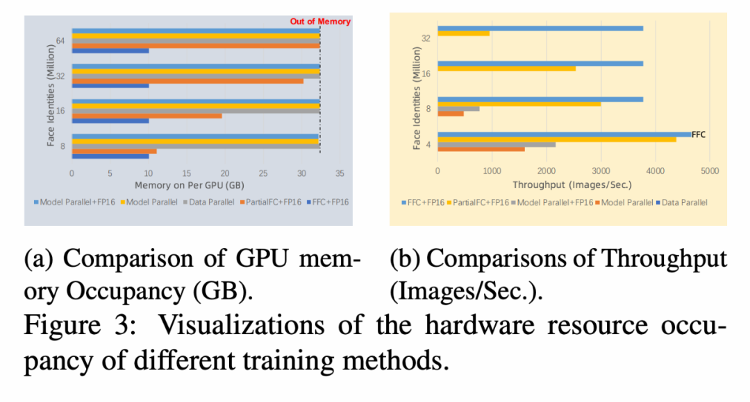 显存越大所需机器卡数越多,成本也就越高,相应多机协同的硬件基础设施成本也越高。与此同时,当分类 ID 数目达到极超大规模的时候,主要计算量将浪费在最后一层分类器上,骨架网络消耗的时间可忽略不计。