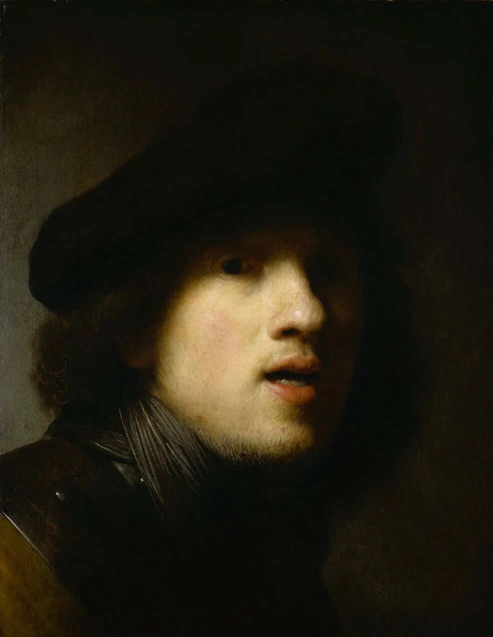 创作这幅肖像时,伦勃朗在他的家乡莱顿还是一个名不见经传的年轻画家。作为自己的小作坊的主人,他磨练了自己的手艺。师从伦勃朗的塞缪尔·范·霍格斯特拉滕 (Samuel van Hoogstraten) 后来写了一本绘画手册,提倡自画像作为捕捉情感的练习,因为它让画家“既是表演者又是旁观者”。伦勃朗的追随者无休止地模仿他的自画像,创造出收藏家热切追捧的整个子流派。对伦勃朗偏爱自画像的另一种更为通俗的解释是,自画像消除了聘请专业模特的需要,而这一因素在他还是一名奋斗中的年轻艺术家时尤其具有吸引力。