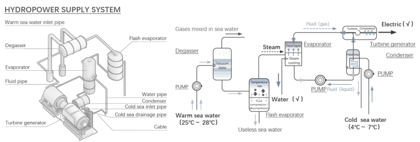 我们利用海洋热电原理获取水下社区所需的电能和淡水资源。太阳能是形成海洋温差能的源头。在各种海洋能之中,海洋温差能属于海洋热能,是由于受太阳辐射的表层海水与较冷的深层海水之间的温度差而产生的能量。海洋温差能具有储量巨大以及随时间变化相对稳定的特点,因此,利用海洋温差能发电有望为一些地区提供大规模的、稳定的电力。它利用浅层和深层海水的温差和不同的温冷热源,通过蒸发器、热交换器、涡轮机等装置,形成一个封闭、循环的能源供应系统。