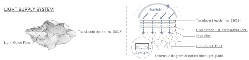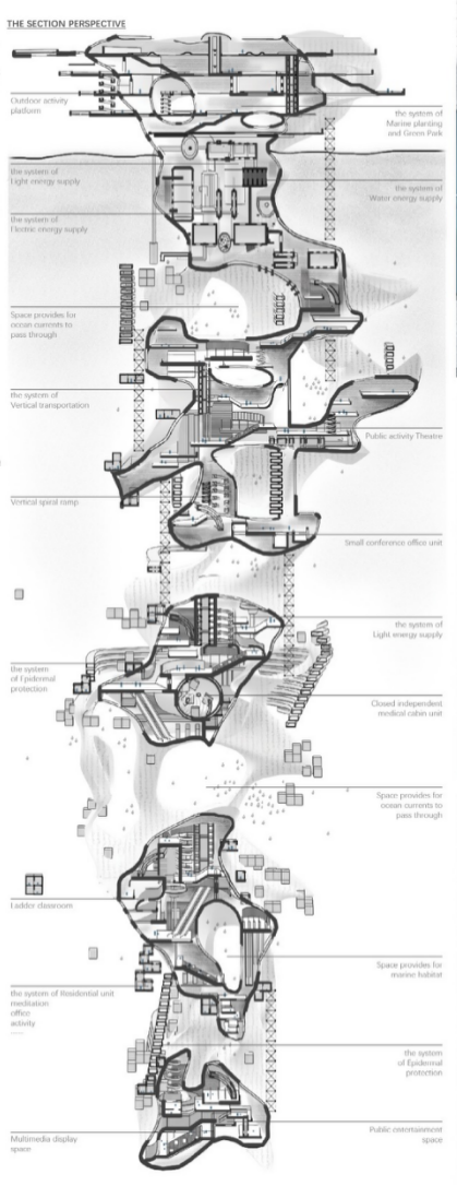 设备区位于种植区下层浅海区域,利用了温度差、光导等原理,提供了居住空间与公共活动空间所需要的基本物理要素,例如光照、水、空气。