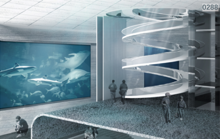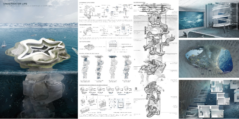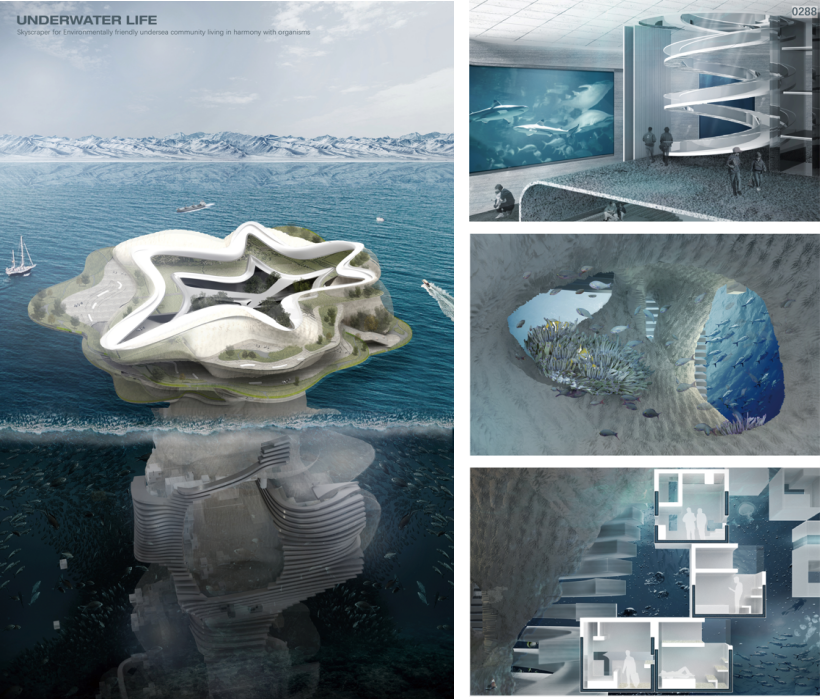 第二张是在海水中,以海洋生物的视角去观察建筑主体,我们希望它是可持续的、与生物友好共生的,所以表达出会有许多海洋植物、动物在建筑外的空腔中自由的生长。