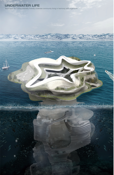 海底社区的概念来自于生命的起源点——海洋,而人类与建筑的关系则类比于珊瑚与生物的关系,友好融合、相伴相生。