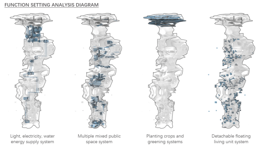 摩天大楼共分为四个部分:种植区域、设备区域、公共空间以及居住单元。我们考虑到,公共文化空间的创新与再造,关键在于有内容,有生命力,有与人的可连接性、可阅读性、可参与性,有鲜明的识别度,以及可持续发展。