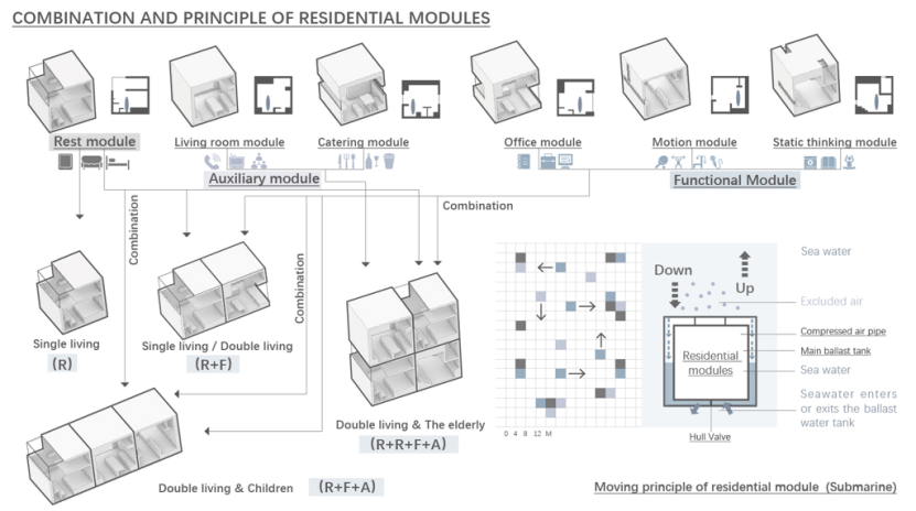 我们探索了一种新的居住群体模式,不同的家庭可以根据他们的需求进行不同的组合。生活模块分为休息模块、辅助模块和功能模块。其中,辅助模块和功能模块处于公共模式。利用潜艇的原理,它们可以在海洋中自由上下漂浮,从而最大限度地利用资源和空间。