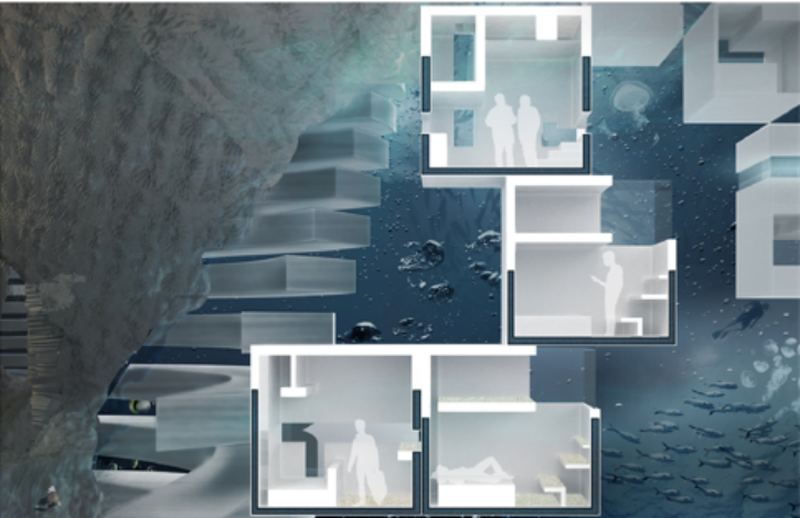 第三张小透视图是表达居住单元的内部空间以及和周围海水环境关系的场景,我们剖开了不同模块的居住单元,去表达人的尺度、内部的空间关系等信息。