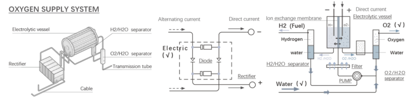 另外,我们利用电解水原理,获得生存、氧气和家用燃料氢的必要条件,通过整流器实现交流电和直流电的转换。