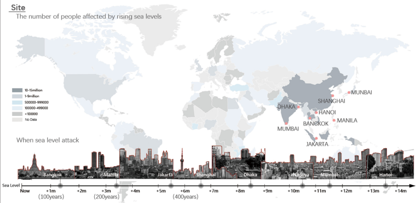 从开始构思竞赛概念时,我们首先了解了全世界目前面临的多种问题与危机,调研后将目光锁定在全球海平面上涨的核心问题。