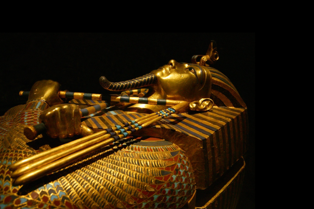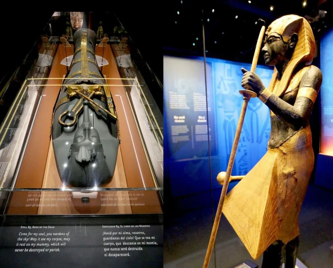 此外,还有图坦卡蒙金棺:赤金镶裹表面,配嵌琉璃和贵重的蓝宝石,作为史上最精致的黄金制品,显示了埃及在制造工艺上的高超水准。