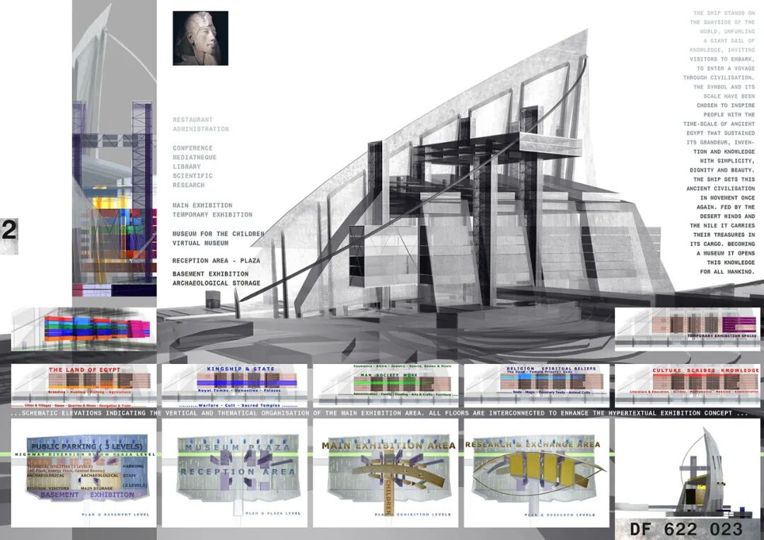埃及文化部征集建筑方案时,曾收到来自82个国家的1557件作品。最终,华裔设计师彭士佛夫妇的 Heneghan Peng 建筑事务所,凭借将数字展示深度融入建筑设计,永久展出重要文物的思路而胜出。