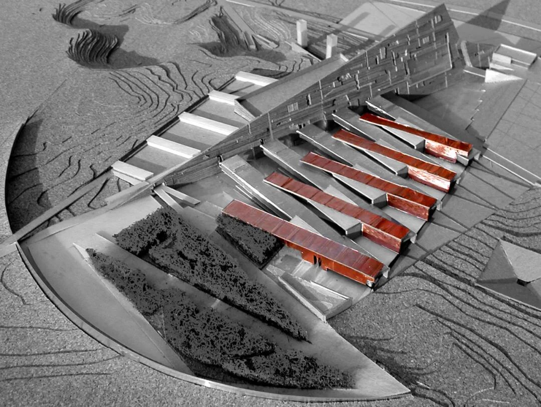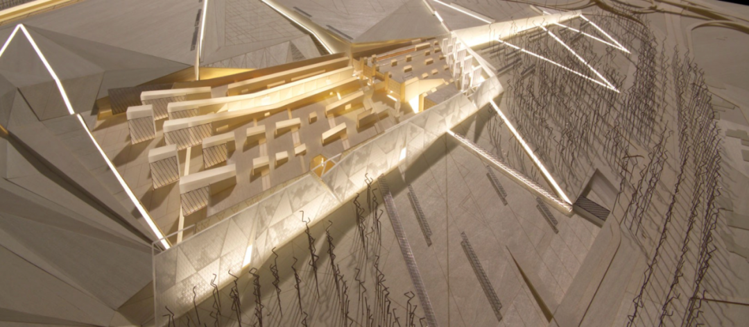 博物馆地处吉萨高原,与尼罗河冲积平原有尽50米的高差。设计巧妙依附地势,呈现出高低错落的层次感,以及褶皱般的不规则设计。