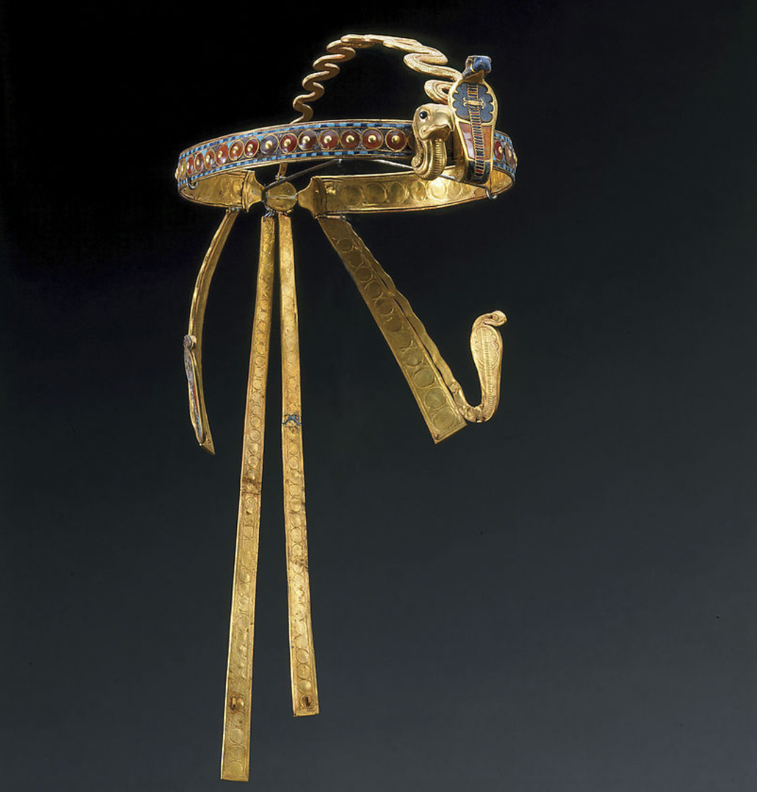 图坦卡蒙金冠正面有一头秃鹰,代表统治下埃及的瓦杰特,眼镜蛇代表保护上埃及的内赫贝特。这些象征着图坦卡蒙对埃及的统治。