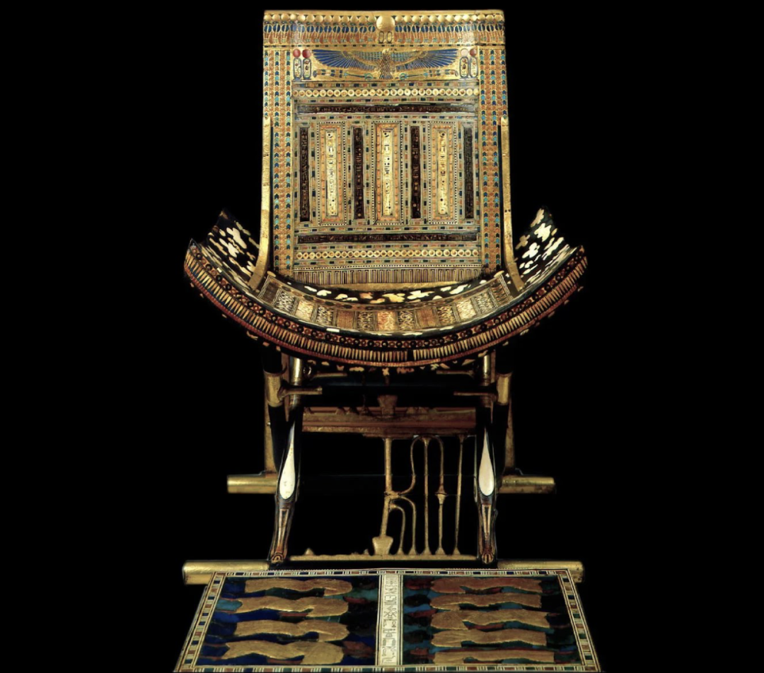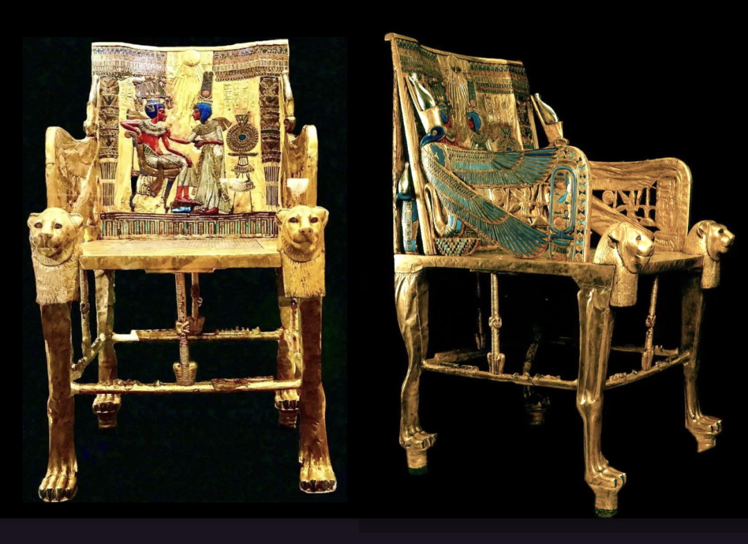 图坦卡蒙黄金宝座同样镶嵌黄金、琉璃与宝石。椅子两侧饰有羚羊图案,扶手刻着「护卫神」狮子雕像。