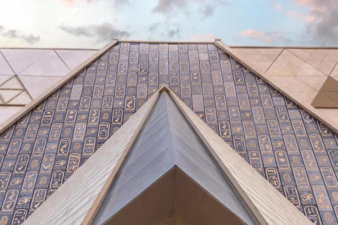 墙面充满古埃及要素,从象形文字到沙漠绿洲,将埃及文化经典以图案的方式呈现。而稳固的三角椎造型,又与远处金字塔遥相呼应。为了体现埃及的传统文明,金字塔和雕塑绝不可少!