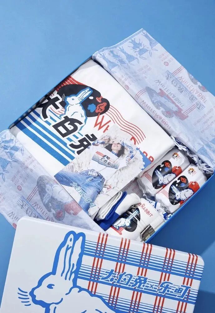 乐町×大白兔,以“无乐不作,快乐分享”为主题带来了联名系列。整个系列配色以大白兔包装纸配色为主,白色和蓝色主打,红色点缀。然后将大白兔的经典图案和服装结合,让乐町的衣服充满了奶香味。