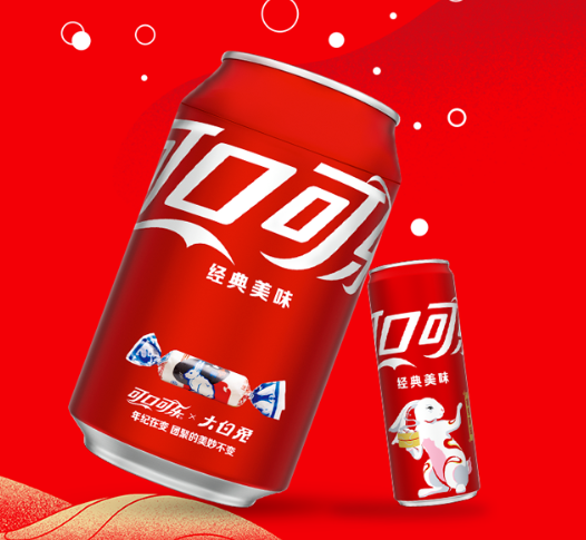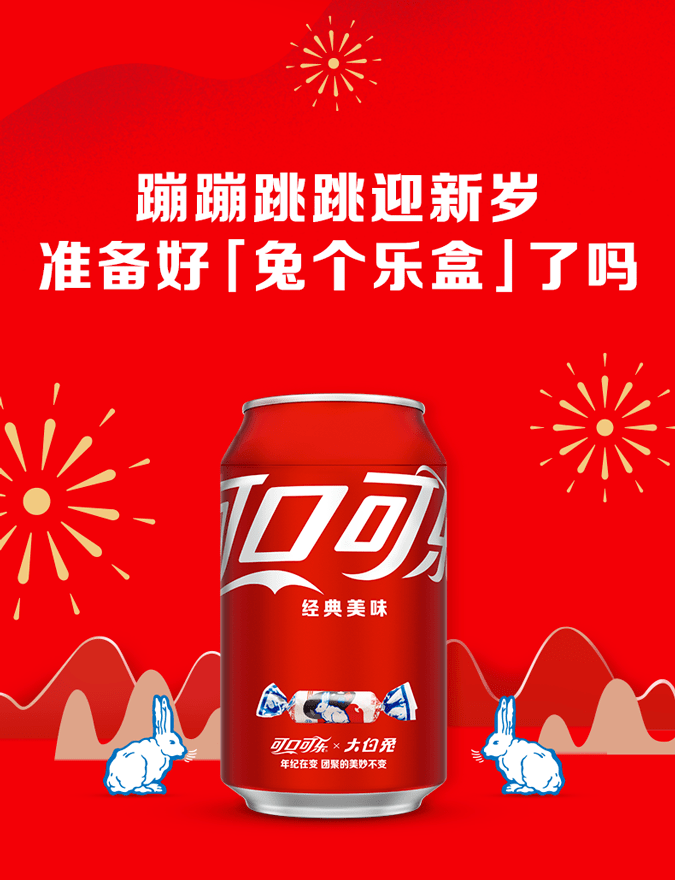 可口可乐与大白兔合作推出「兔个乐」新包装,罐身印有大白兔奶糖经典图案和兔子造型,甜蜜“兔”袭,给消费者满满甜蜜。