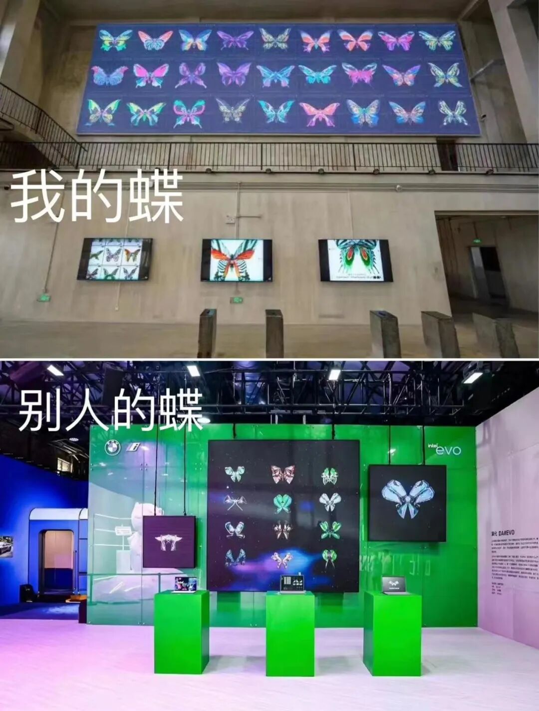 7月26日,@大悲宇宙-林琨皓 (以下简称大悲)在微博公开质疑称,日前在广州太古仓举办的宝马展览活动中,由同济大学创意设计学院副教授张周捷为BMW i和英特尔Evo品牌打造的可视化数字艺术作品“蝶”,与自己的作品“虚拟蝴蝶”高度相似。
