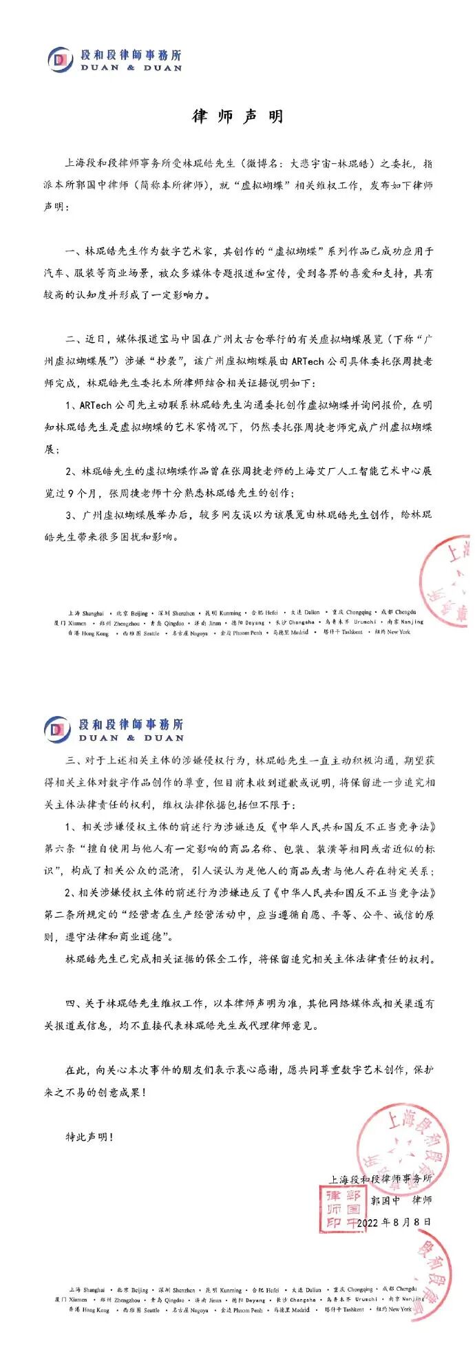 8月8日,@大悲宇宙-林琨皓针对此前“虚拟蝴蝶”被抄袭事件再次发布声明,表示“维权工作已委托律师团队负责。愿共同尊重数字艺术创作,保护来之不易的创意成果。”不少网友在评论区评论,希望维权成功。