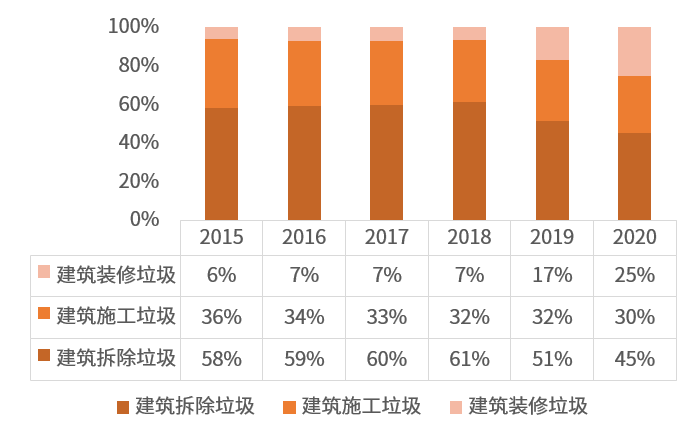 2020年,我国建筑总垃圾量中,旧建筑物拆除占45%左右,建筑施工产生的建筑垃圾占30%左右,建筑装修所产生的建筑垃圾占25%左右。