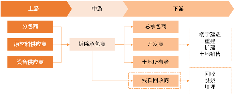 很明显,建筑垃圾是建筑拆除的必然产物,中国建筑节能协会将废弃物(建筑垃圾)处理与建筑拆除以并列的关系放在了建筑全生命周期的同一阶段,足以可见其在行业价值链下游是一个非常重要的环节。